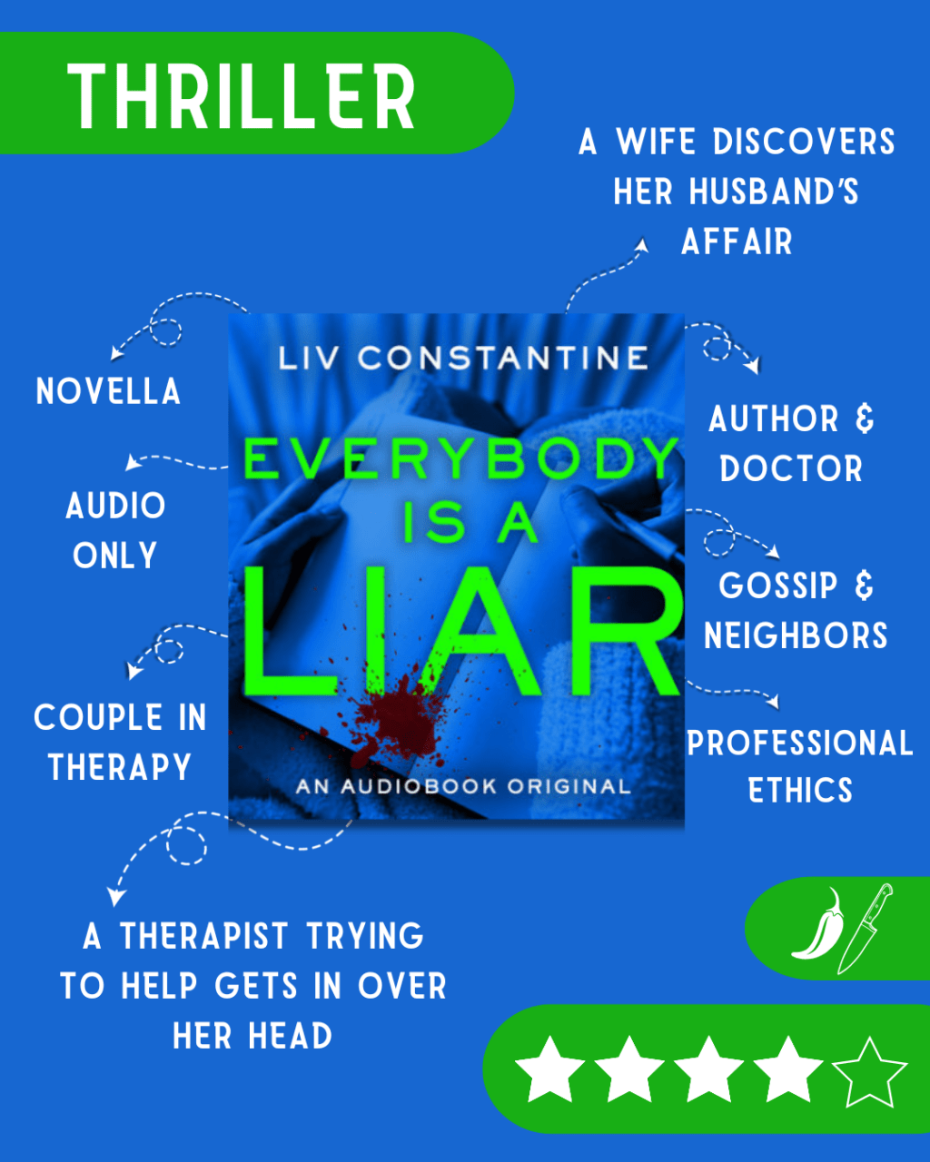 This novella captures all the intrigue and tension youβd expect from Liv Constantine. Though brief, the story unfolds quickly and wraps up in a satisfying way, reminiscent of The Last Mrs. Parrish. The audiobook is a fantastic full-cast performance that brings the characters and suspense to life. At just three hours, itβs the perfect listen for a road trip, running errands, or tackling household chores. Fast-paced, gripping, and fun!
