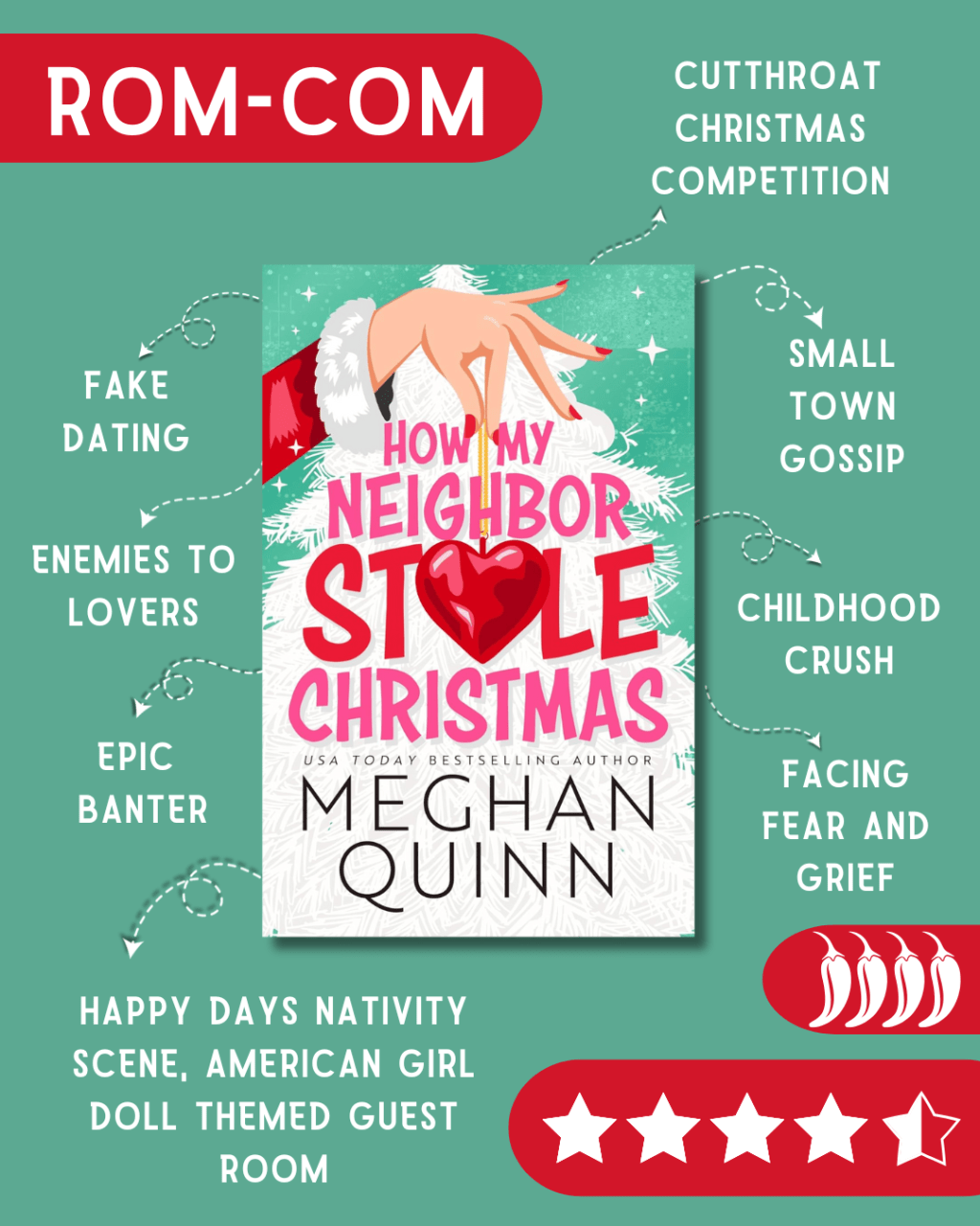 This book is everything youโd expect from a Meghan Quinn rom-com: hilarious, spicy, and brimming with heart. Beneath the festive rivalry lies a touching story of Cole’s struggle with loss and how Storee helps him rediscover the joy of the season. If youโre a fan of small towns, nosy but lovable neighbors, laugh-out-loud hijinks, and quirky details like a Happy Days TV show-themed nativity scene, an eccentric American Girl-themed guest room, or questionable candy cane usage, youโre going to adore this holiday romp. Itโs another gem from Quinn!