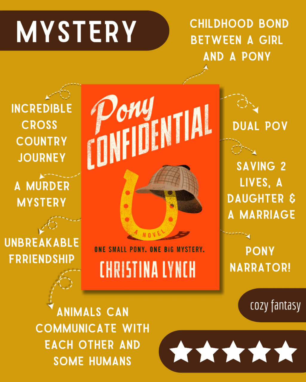 If you loved mystery books as a child where animals were fully realized characters with heart and humor, Pony Confidential is the grown-up version with extra layers of emotion, complexity, and charm. The dual POV between Penny and the pony offers a beautifully balanced narrative, with Penny grappling with her past and present while the pony faces his own share of high-stakes adventuresโsome death-defying, some comedic, and all deeply moving. At the heart of this story are themes of love, friendship, and kindness, with a reminder of how loyalty can transcend time and even species. Itโs a warm, nostalgic nod to the cozy, magical mysteries that so many of us grew up reading.