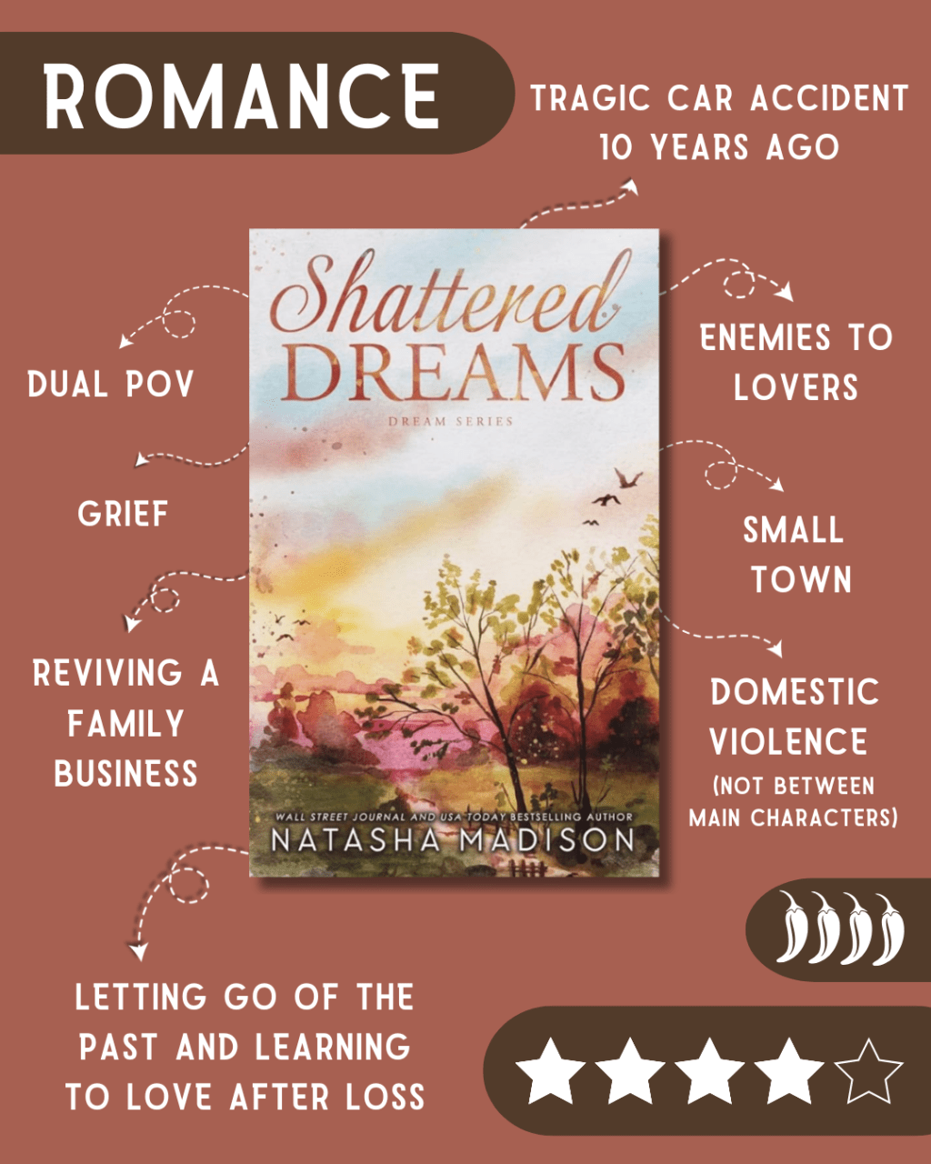 This was my first book by Natasha Madison, and when I say I couldnโt stop listening to the audiobook, I mean itโI was hooked from the very first paragraph. The story begins with the dramatic accident that changes everything, pulling you in immediately. Madison expertly explores how Charlie and Autumn each cope with their grief, making their journey powerful and raw. Fair warning, this is a very spicy book, with the tension between them playing out both in their hatred and their eventual healing. I also loved the interesting secondary characters, and I canโt wait to see how they evolve in future books of this series.