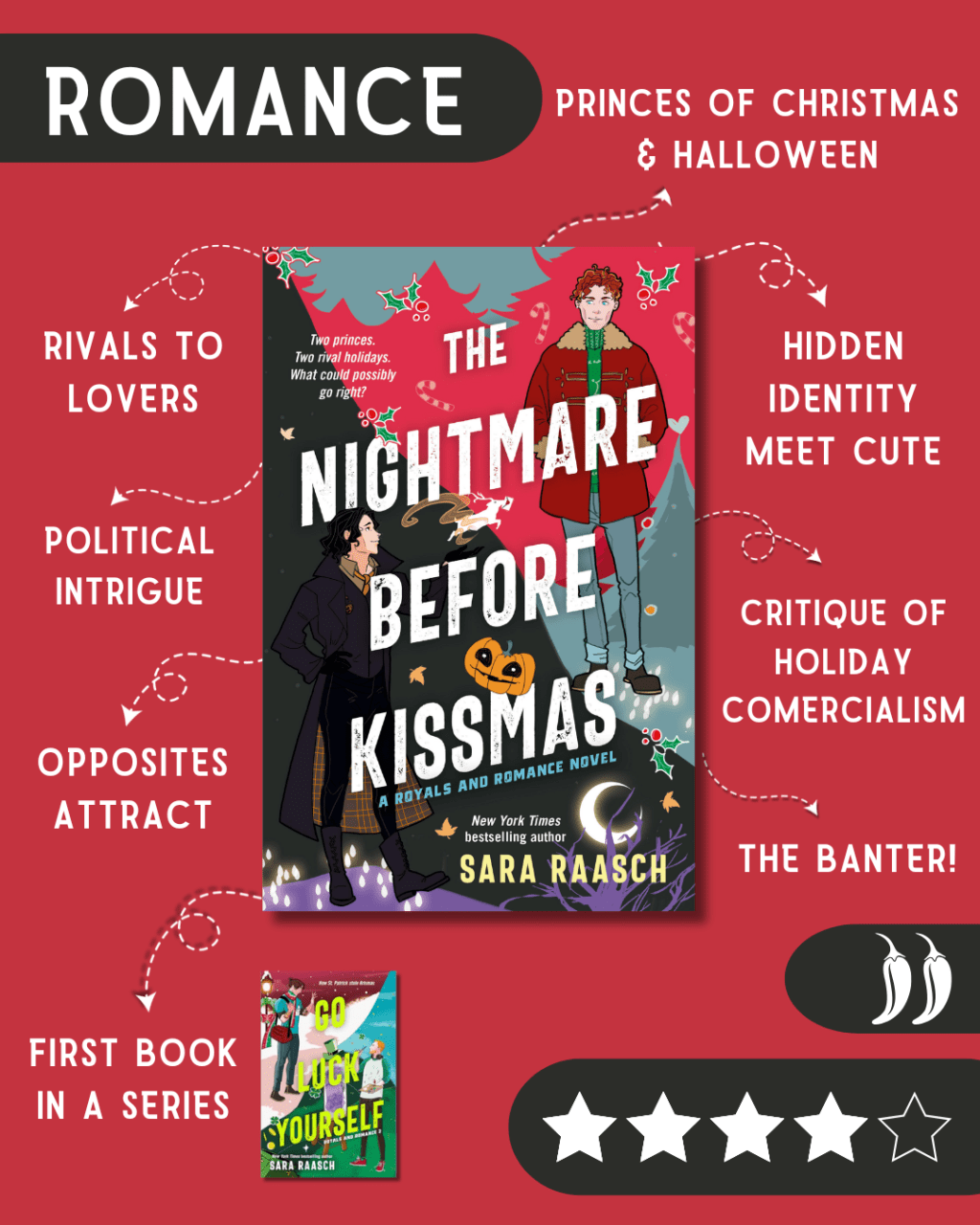 If you’re a fan of Red, White & Royal Blue, this book will feel like a whimsical, holiday version you never knew you needed. Coal’s chaotic energy channels Alex, while Hex’s thoughtful demeanor mirrors Henry, and much like in RWRB, their love story beautifully navigates the tension between desire and duty. I adored the critique of holiday commercialization, reminding us how easy it is to lose sight of the true spirit of the seasons amid the rush for presents, candy, and costumes. It’s a fun, heartwarming, and sweet & spicy LGBTQ romance that kicks off a new series. I’m already looking forward to more, especially since secondary characters like Iris and Coal’s brother, Chris, were such vibrant parts of the story.