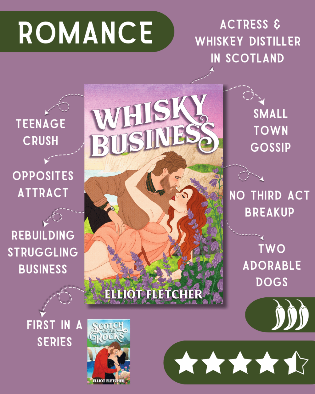 Although many dream of a life on the idyllic Isle of Skye, April Sinclair spent her childhood wanting to escape and become a famous actress. Well, be careful what you wish for because fame can be fickle. Once famous but now floundering, April returns to Scotland to distract herself by attempting to save her familyโs failing distillery, which she has recently inherited. Once there, she finds distiller Malcolm Macabe, who, despite his grumpy exterior, also wants to save the distillery. Opposite to April in every way, Mal would rather live quietly in the shadows with his whisky and dog but canโt seem to get April out of his head – or his business! It doesnโt help that their dogs have become fast friends, and as April infuses herself into his life, Mal begins to want anything sheโll give him before she returns to her life of fame and fortune.
