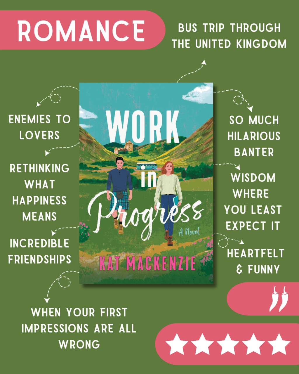 This book was such an absolute joy to read. The banter is off the charts. The slow-burn enemies-to-lovers was perfectly done. We get lots of character development of Alice and Robbie before they connect, which made me feel like we earned their relationship. However, the most powerful part of this book is the bond between all the tour group members. They are all richly crafted characters that add significance to Alice’s journey. It was a powerful reminder that life is a journey, and although we can’t start over, we can choose the path forward. Mackenzie wrote big, bright characters that are complex and subtle. She imbued meaning into moments and objects. I defy you to think of mayonnaise or blue thread without thinking of this book once you finish it. You know a book is wonderful when you find yourself wondering what those characters are doing now. That’s how I am about this book.