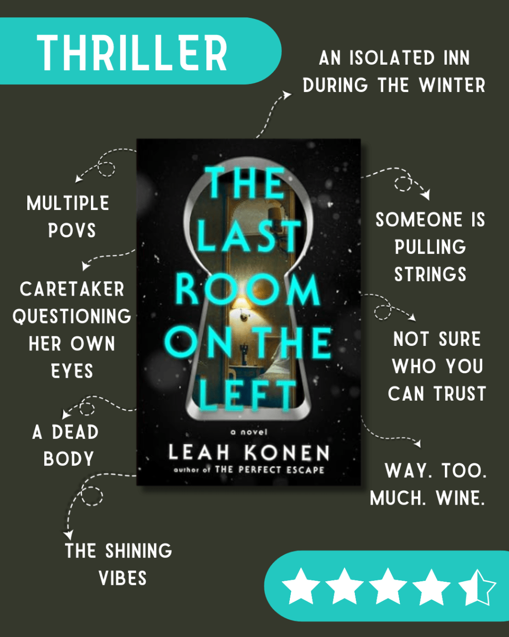 The Last Room on the Left by Leah Konen (January 14, 2025) Thank you, Putnam Books and PRH audio, for the gifted advanced listening copy of this atmospheric winter thriller!