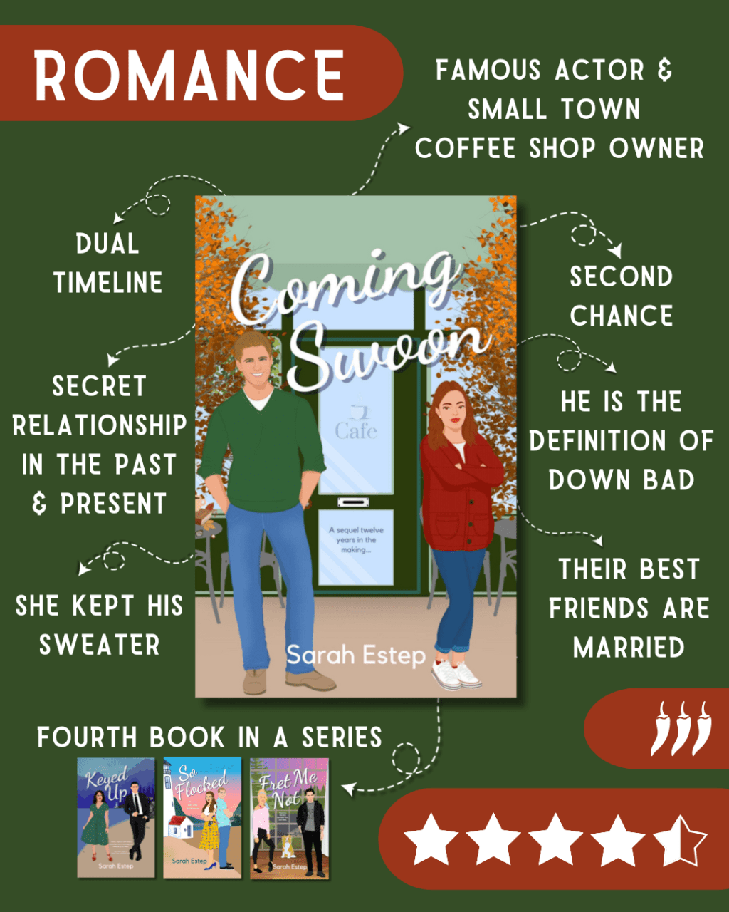 Coming Swoon by Sarah Estep (March 13, 2025) Huge thanks to the author for the gifted advanced reading copy of this book! I am completely enamored with Sarah Estep’s Brunch Bros series and the wonderfully immersive world of Crane Cove she has created. This small-town romance series keeps delivering, and Coming Swoon is no exception!