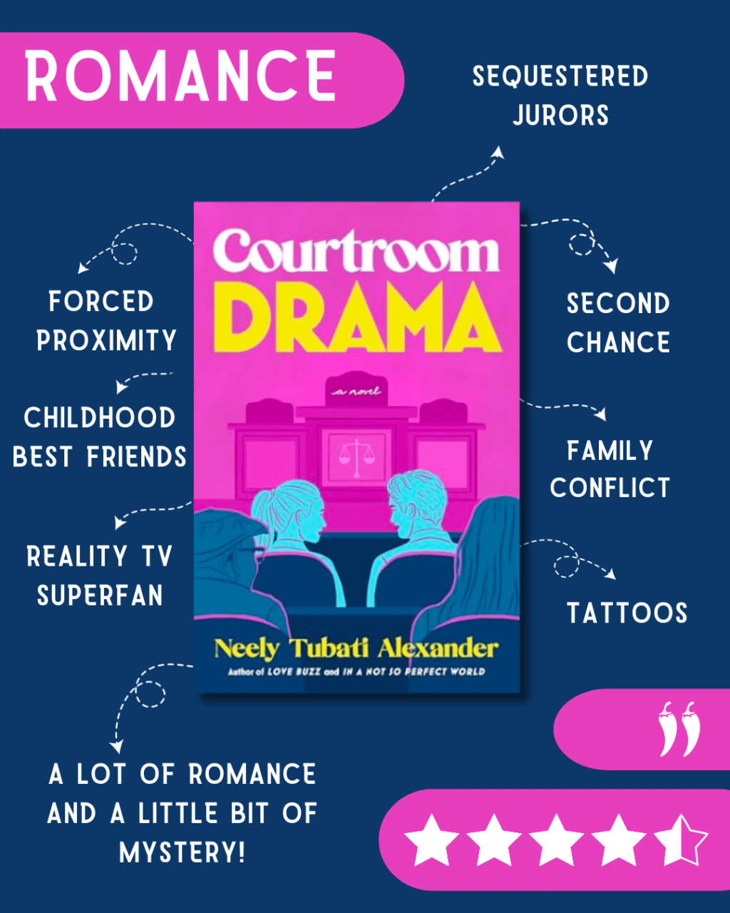 Courtroom Drama by Neely Tubati Alexander (May 20, 2025) Thank you, Harper Perennial (digital) and libro.fm (audio) for the gifted advanced copies of this incredibly entertaining and inventive novel that is a lot of romance and a little bit of mystery wrapped in Jury Duty and Real Housewives. I couldn’t put it down!