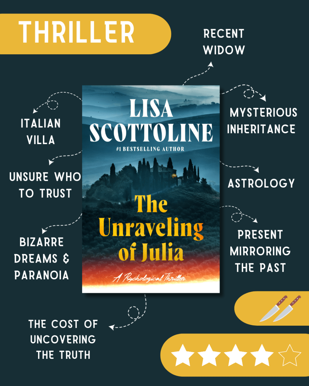 I love a “is she being hunted or is she unraveling” thriller, and this one delivered in truly unique and eerie ways. The Italian countryside adds a lush, cinematic atmosphere while the villa itself is a haunting character all its own. Julia is a layered protagonist – vulnerable yet determined – and Scottoline gives her real emotional depth as she works through trauma, grief, and identity.
