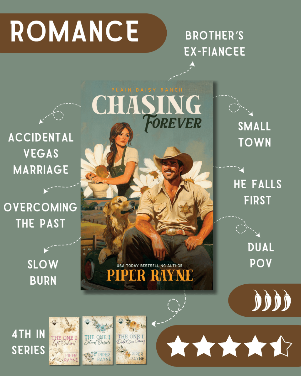 If you loved Rebel Blue Ranch or Chestnut Springs and are craving another cowboy/ranch romance series with lovable, interconnected characters, this series is absolutely for you. While I’ve enjoyed every installment, Chasing Forever is hands-down my favorite – Brooks and Lottie’s story has been building across the earlier books, and this felt like the ultimate payoff.