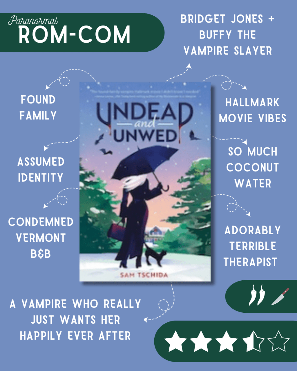 Then a couple of things happen…she accidentally almost kills her neighbor, having no choice but to turn her AND a lawyer reaches out that the human who’s identity she has assumed has inherited a Vermont B&B. Tiffenie sees this as a sign for her small town Hallmark movie meet cute. She just has to drive a hurse cross-country with a newly turned vampire in a coffin. Then, when she arrives, she’s got a quirky small town with a hot Christmas tree farm owner. She thinks that must be a sign…until Vald, her maker and former partner shows up. Now we’ve got ourselves a love triangle, a small town that now has vampires, and a B&B that is actually condemned. And that’s just time beginning!