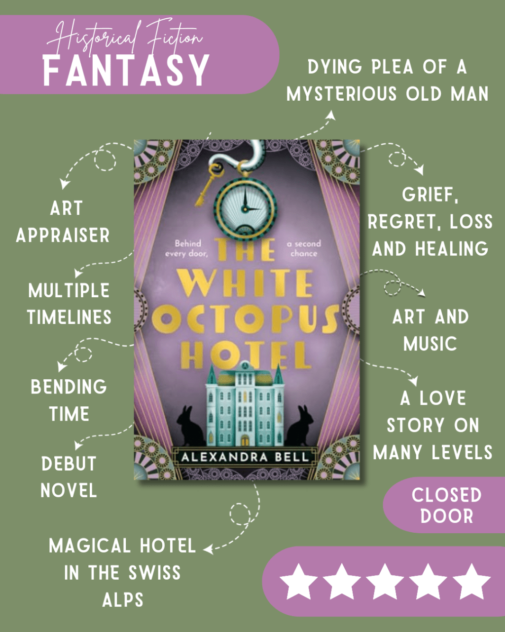 In 2015 London, art appraiser Eve Shaw is visited by a mysterious old man. The man bears a striking resemblance to her favorite composer, Max Every, although Everly was born over 116 years prior. The man gifts her a small white porcelain octopus with the very tip of one tentacle painted black. There was no reason this stranger should know her love of the octopus and the gifted one is almost identical to the one which she has tattooed on her leg. Later, she discovers a tentative connection between Everly and an old, now abandoned hotel called The White Octopus. What follows is a sweeping, time-bending story of love, loss, grief, regret, and forgiveness told both across time and outside of it as Eve works to unlock the secrets of The White Octopus Hotel.