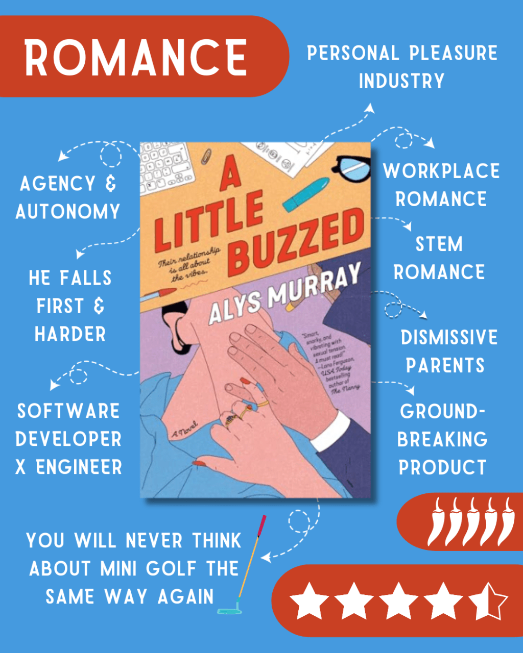 Add in fantastic side characters, a high-stakes race-to-market for a groundbreaking product, swoony yearning, and laugh-out-loud moments (I promise you’ll never look at mini golf the same way again), and you’ve got a romance that’s as fun as it is affirming.